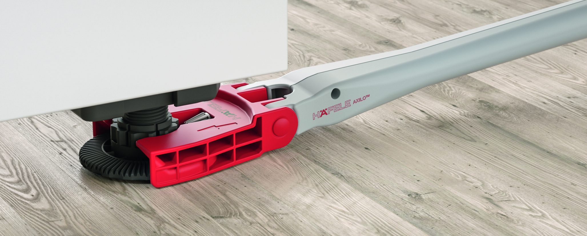 The Häfele AXILO™ plinth adjusting fitting system– the extended lever for cabinet leveling. Every kitchen installer knows the problems with the leveling of kitchen furniture over the plinth feet, in particular the rear ones … Häfele’s clever new adjustment system puts an end to it. The adjustment is done ergonomically and back friendly from the front, with simultaneous monitoring of the level. All told one can save up to 50% of the assembly time. Small cause – great effect. **