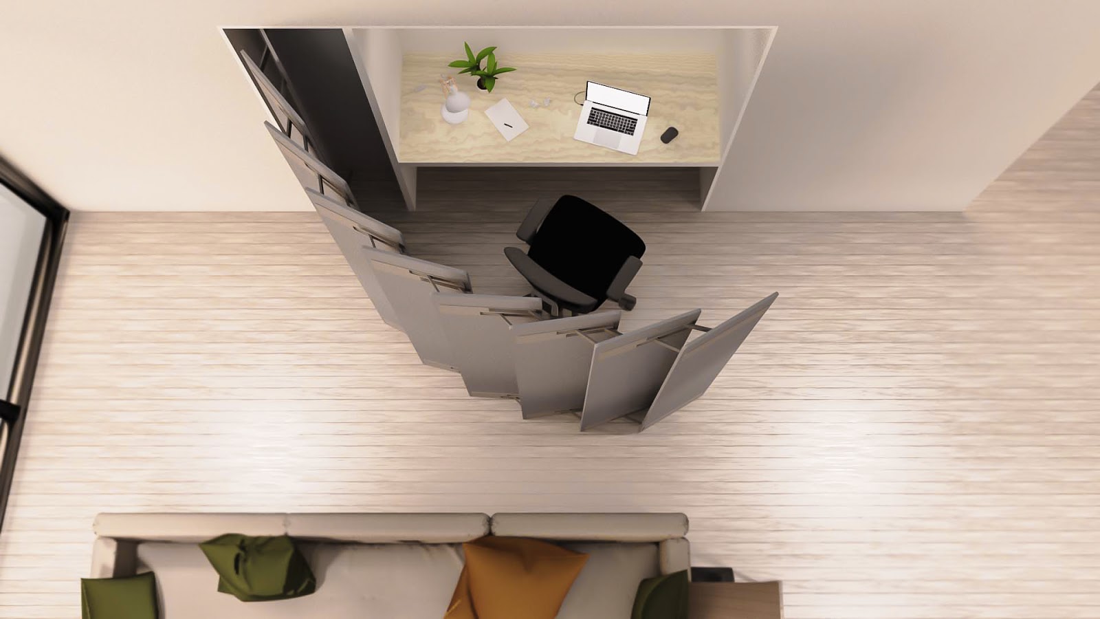 Early on in the process we decided to focus our efforts on a built-in solution rather than a standalone solution. Research and common sense told us that there is a trend towards high-density housing, with young professionals moving into apartments and row-houses in large cities, with many of these houses having little room for a WFH office space. This is the market we are targeting with this concept. We want to create a long-lasting, high-quality product that will really add value to its users over the long-term.